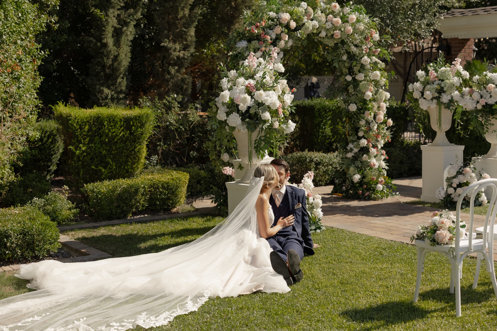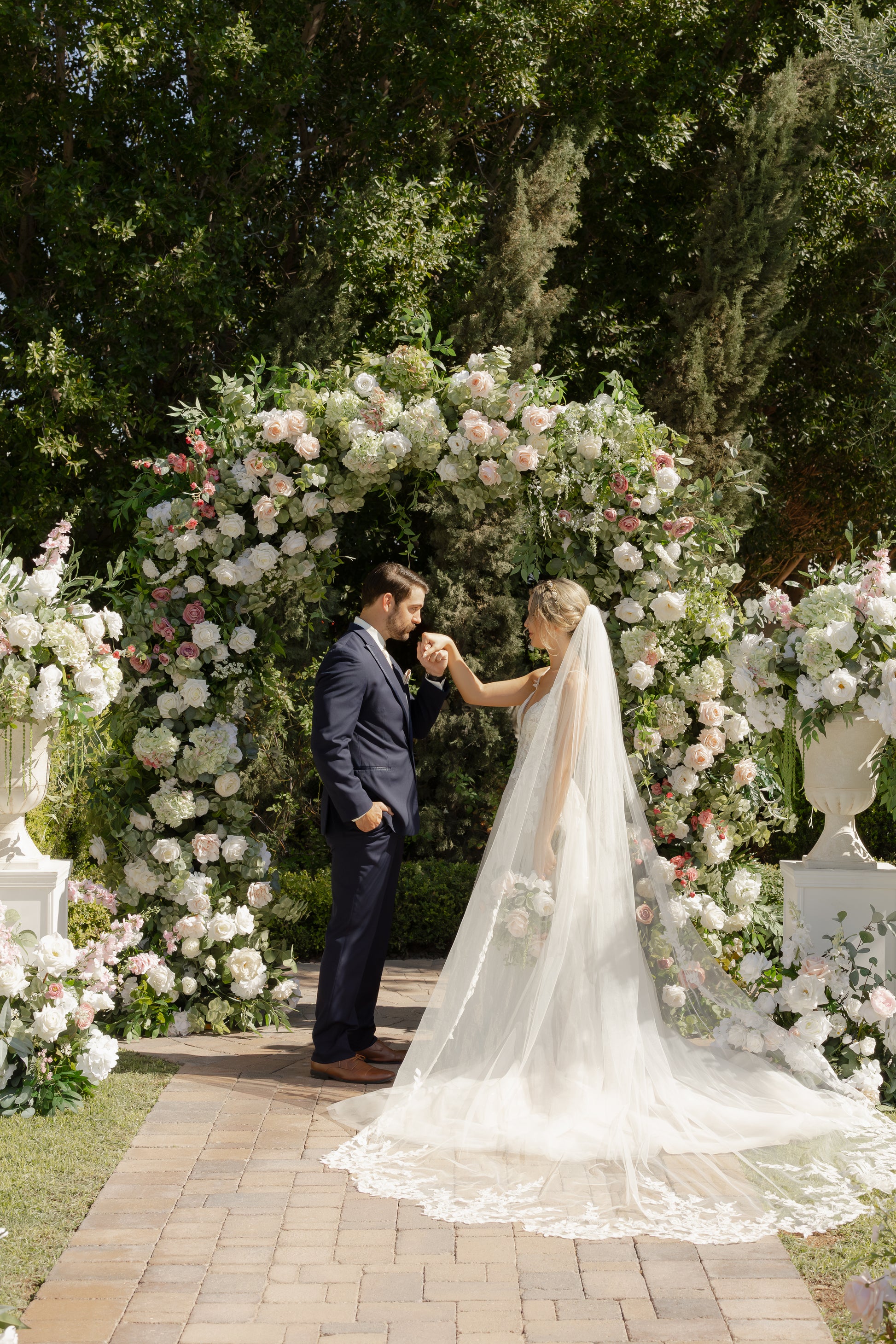We used hydrangeas, white garden roses, white playa blanca roses, white delphinium, ivory veronica, white ranunculus, ivory peonies, white lilac, ivory rose buds, with seeded eucalyptus, and sage spiral eucalyptus. The shape of the arch is the newest trend for weddings, although it is a very classic style that will always be in. You also have the option of adding pops of color!